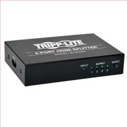 Tripp Lite's B118-004, 4-Port HDMI Splitter allows the digital signal from a Blu-Ray player or other HDMI device to be displayed on four HDMI displays. Connect a DVI-D Single Link display using an HDMI to DVI adapter, such as Tripp Lite's P566-Series cables. Installation is quick and simple, with no software or drivers to install. Locate your HDMI source up to 13 ft. (4 m.) from the splitter, and the splitter up to 16 ft. (5 m.) from a display, for a max distance of 29 ft. (9 m.) between source and display. Multiple splitters can be cascaded together to connect additional monitors, with no more than 6 levels of splitters in all. Supports HD video resolutions up to 1080p, and computer video resolutions up to 1920 x 1200. High Speed HDMI and 3D compliant, with support for 36-bit Deep Color (12-bits per channel). Supports DTS-HD, Dolby True HD and 7.1 Channel Surround Sound audio. HDCP and EDID compliant