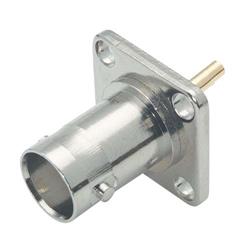 此款母頭BNC射頻插座連接器采用四孔方型面板安裝法蘭和用于連接PCB的焊杯端子。BNC連接器連接扭鎖,因而特別適合射頻應用。