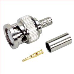 This male BNC connector is designed for crimp attachment to Belden 7807 style coaxial cable utilizing a standard crimp size of .213" for the crimp ferrule. The contact pin is designed for solder attachment to the cable center conductor. BNC connectors connect with a twist lock, making them popular for RF applications.
