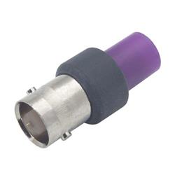 此款BNC母頭端接器采用絕緣機身和紫色帽并且適合RG59等75歐姆同軸線纜,此紫色帽表示75歐姆的阻抗值。采用?瓦特、70度的金屬膜型電阻,此電阻的容差為+/- 1%。