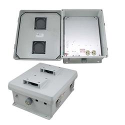 The Enclosure...The box is a rugged weatherproof enclosure that is ideal for both indoor and outdoor applications. Constructed from molded fiberglass reinforced polyester, it is well suited for high temperature or corrosive environments. The mounting flange allows it to be wall mounted as well as on a flat surface. The raised lid features a stainless steel continuous hinge and stainless steel quick release latches with padlock hasps. The raised lid is fully gasketed. The enclosure material is UV stabilized and comes in machine tool gray. Mounting Plate...The aluminum mounting plate has provisions to mount WLAN equipment from Cisco?, Symbol?, D-Link?, HyperLink and more (see mounting plate drawing). Other HyperLink equipment such as Power-Over-Ethernet products and Power Supplies can be mounted as well. The plate features a standard surge protected, duplex 120 VAC outlet and a terminal block for easy hook up to the externally provided line power. Vented Enclosure...The NB121005-10V features a vented lid with removable filters and vent covers on the outside of the enclosure. Lightning Protection...Surge protection is provided as a standard feature on the internal AC outlets. In addition, the unit can accept up to two optional bulkhead-mount N-Type lightning protectors to protect the coaxial cable runs. The HGLN-CAT5 lightning protector can be used with Power-over-Ethernet applications and custom mounted in the enclosure. 特征