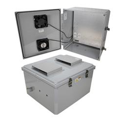 The box is a rugged weatherproof enclosure that is ideal for both indoor and outdoor applications. Constructed from High-Impact, UV Resistant Polycarbonate material that provides superior durability to impacts and ease of modification while maintaining minimum weight. It is well suited for high temperature or corrosive environments. The lid includes two vents with installed rain guards and filters. The included wall mount brackets come uninstalled and bagged with their hardware inside of the enclosure. Once the brackets are installed the enclosure can be mounted directly to any flat wall surface provided proper screws are used into secure studs. The brackets, once installed, also allow you to use our HGX-PMT pole mount kits. The lid features a non-metallic hinge system that allows for quick removal & can be reattached just as quickly without the need for any tools. The enclosure comes with a pair of stainless-steel latches with padlock eyes allowing you to secure the enclosure from tampering. The enclosure comes in a Dark Gray (Pantone 422C) Mounting Plate The aluminum mounting plate included with the NBPC181610-10FS features standard surge protected duplex 120 VAC outlets and a terminal block for easy hook up to externally provided line power. The enclosure also features holes for two N-Bulkhead lightning protectors or connectors, a grounding lug and cable conduit connector. Cooling To help ensure trouble-free operation of electronic equipment, proper operating temperatures inside an enclosure needs to be maintained. With the built-in dual cooling fans, internal temperatures can be better maintained. This model is ideal in hot environments. The fans are controlled by an integral high current solid state AC relay. The relay features Zero Cross Detection for EMI reduction. For Cooling the NBPC181610-10FS includes our exclusive solid state temperature controller connected to dual 16.4W (32.8W total) fans. The high airflow, low noise fans used allow warm air to be actively pushed out the top vent while the second fan on the lower vent actively pulls in outside air into the enclosure. Filters for both ports prevent foreign objects or debris from entering the enclosure. The controller features improved temperature set point accuracy. The fans turn on when the internal temperature rises to 90° F (32° C) ±5° and turn off at 81° F (27° C) ±5°. The cooling fans do not require the use of any of the AC outlets, leaving them all available for your equipment. The HGX-PMT series of pole mounting kits allow the populated enclosure to be securely mounted to a variety of different size poles. Compatible versions include HGX-PMT13, HGX-PMT16, HGX-PMT28, HGX-PMT29, HGX-PMT30 & HGX-PMT33 附件