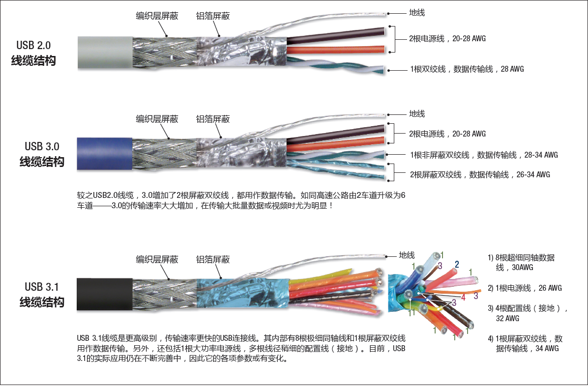 USB3.0 線纜是由2根電源線,1根非屏蔽雙絞線和2根屏蔽雙絞線進行數據傳輸。