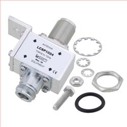 RF surge protector (also known as lightning arrester) LCSP1024 from L-com utilizing a proprietary surge protection technology protects critical hardware from lightening events while maintaining the RF performance. This RF surge protector component is manufactured in a coaxial in-line design with wide operating frequency range and available in stock with same day shipping. Optional weather proofing kit and copper cleaning kit are available for purchase separately.