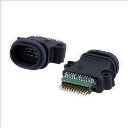 IP68 Panel mounted USB 2.0 Type C female board connector with PC tails to work with the U3A00064-xxM series cables. IP68 rated for use in harsh and ruggedized environments.